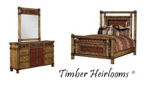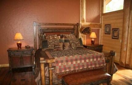 We choose the Timber Heirlooms collection because of the mixture of wood tones and this collection had just the right brick red leather used to help set the right tone for the look to the Master Bedroom rustic decor.