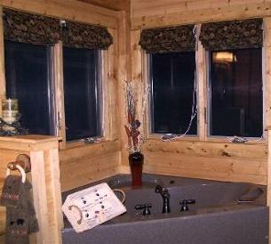 The loft above also serves as a retreat to the Master Bedroom so we choose to coordinate the bedding and use the same fabric elements and design for this Master Bedroom suite. In the Master Bath room we used the same roman fabric shades with leaves to complete the look.