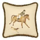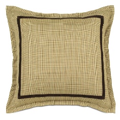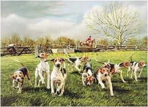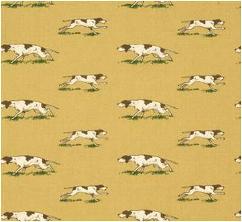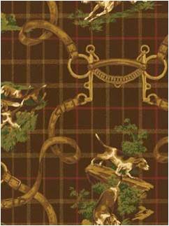 Hunting Dogs and Horses is the design theme for this lovely guest bedroom. A Diamond check and plaid underscore a preppy English hunting dog fabric in the Wellington bed collection. Its traditional design arranges neutral shades of cream and chocolate brown with soft fabrics, recollecting warmth and comfort. Casual roll up shades with a custom padded heardboard and bench in the hunting dog fabric complete the look