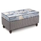 The theme for this project was a nautical them that depicts blueprint sketches of sailboats amidst a watercolor palette of blues and crisp white. Textured cable knit, rope trimming, and hand-painted accent pillows with coordinating window seat and bench that perfectly complement the collection's nautical theme. The styling of the furniture provides a true coastal look.
