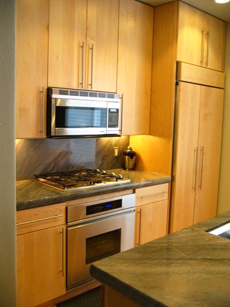 What the homeowner disliked most about the old kitchen was that it was small cramped and she said, " it felt like I was cooking inside a cave". The Wyatt Remodel Project involved taking a small out dated kitchen and using the old kitchen as a den/office. This involved adding a wall and moving the new kitchen into the living and dining room area. This enabled us to transform the kitchen into a sleek contemporary designer kitchen. This project had a space constraint so we utilized a 36" side by side built in refrigerator and the built in oven was placed on the lower cabinets to maximize wall space.